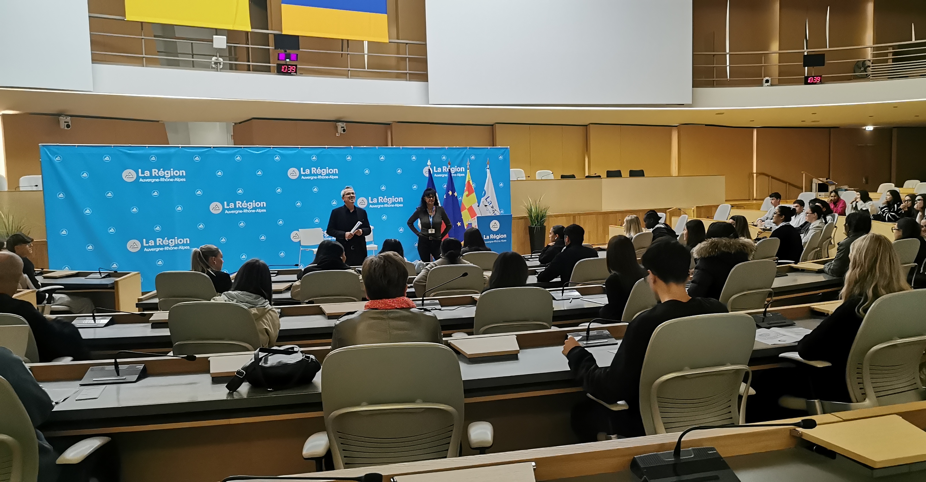La journée a commencé par une visite du Conseil régional Auvergne-Rhône-Alpes. Les élèves et les étudiants ont été accueillis par une présentation sur le fonctionnement, le rôle et les missions de cette administration dans la salle de l’hémicycle Georges Pompidou, assis dans les sièges des conseillers régionaux
